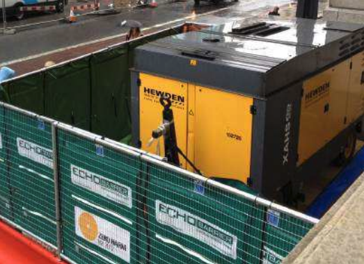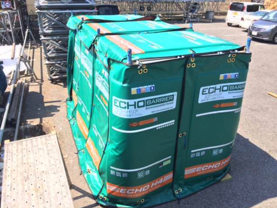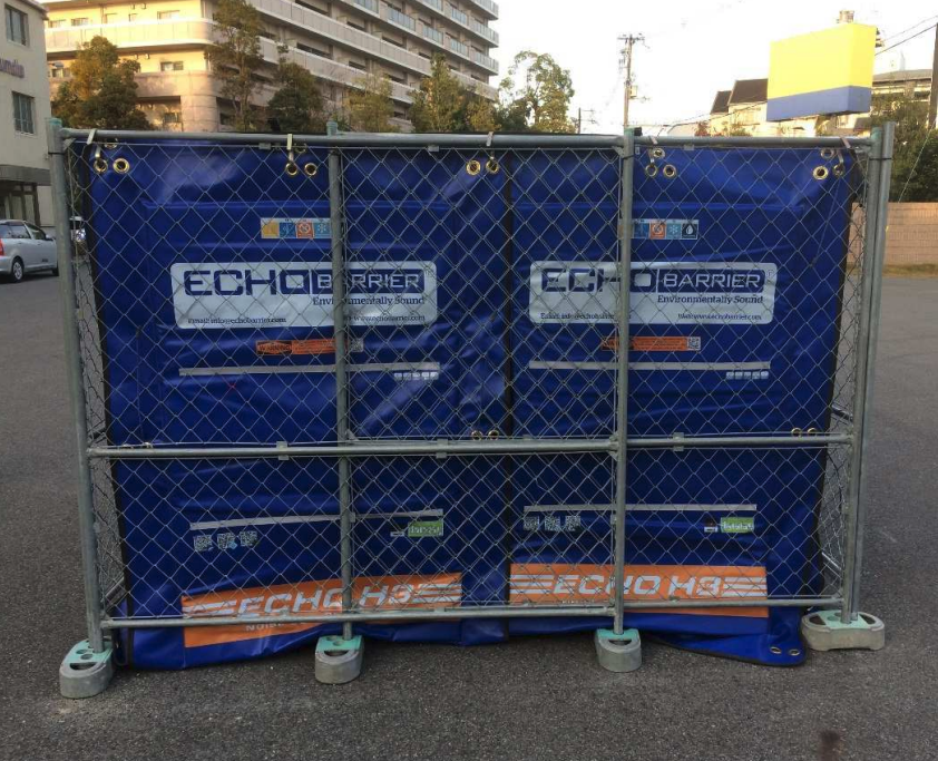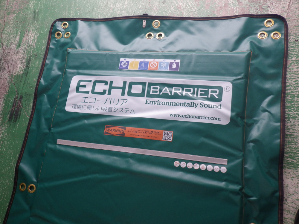 エコーバリアは、工事現場や仮設設備などの単管や金具などに容易に取り付けすることができる防音材です。欧米などでは広く一般的に使用されている耐候性に優れ、一般的な工事現場で使用される防音シートは、いわゆる遮音シートです。現場内で発生した騒音を外部に漏れないように措置が取られています。つまり一般的な防音シートで遮られた騒音は反射し工事現場の上部(空)へ逃げる仕組みとなります。しかし、エコーバリアは吸音材の入った防音シートとなるので、騒音を吸収しながら遮るために、室内工事、狭小区域での防音対策が可能です。特に室内での騒音対策は、反響音が大きくなることが多く、非常に環境が悪くなることが懸念されます。しかし、エコーバリアは騒音の発生源側に吸音対策をし、外部側に遮音対策を施しているために、騒音源の反響音を抑制して内部の作業環境改善を行うことが可能となります。