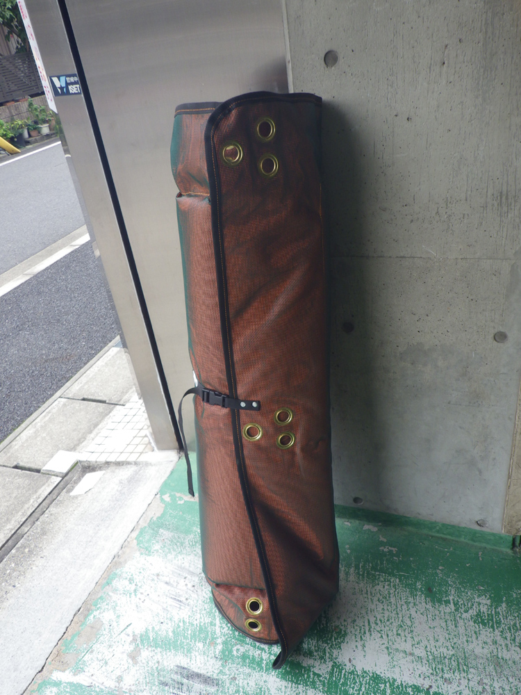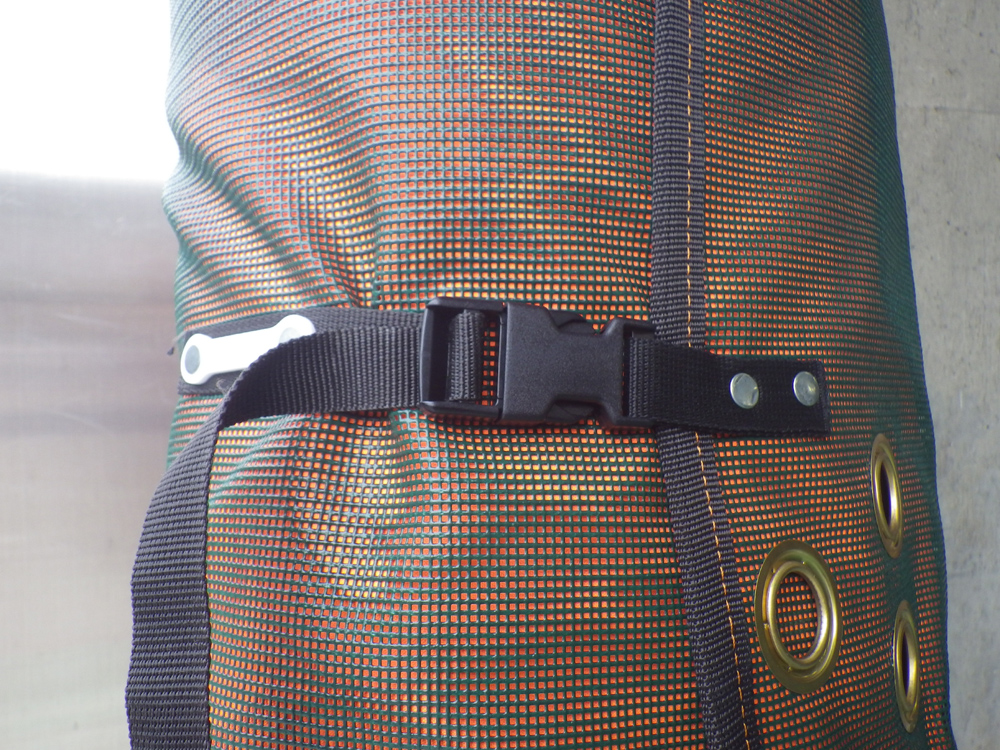 裏側(オレンジのシートとメッシュの面)にベルトとアタッチメントが付いており、エコーバリアを巻いて止めるだけで簡単に持ちやすく撤去作業ができます。