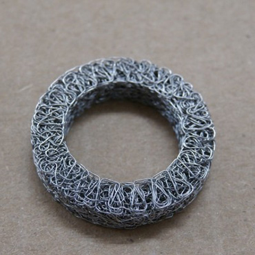 このワイヤーメッシュ制震材ですが、先日は人工衛星内の環境下でも検討に上がるくらいの材料のようです。無重力、急激な温度変化など環境を選ぶことが非常に少ない材料であると思います。この製品は、主に自動車の過熱する部分に使用されています。金型を作成し、メリヤス編みの反物を作成し、必要分だけ型にはめ込み成型する工程です。原始的ですがワイヤーの特性を十分に生かした緩衝材と言えるでしょう。