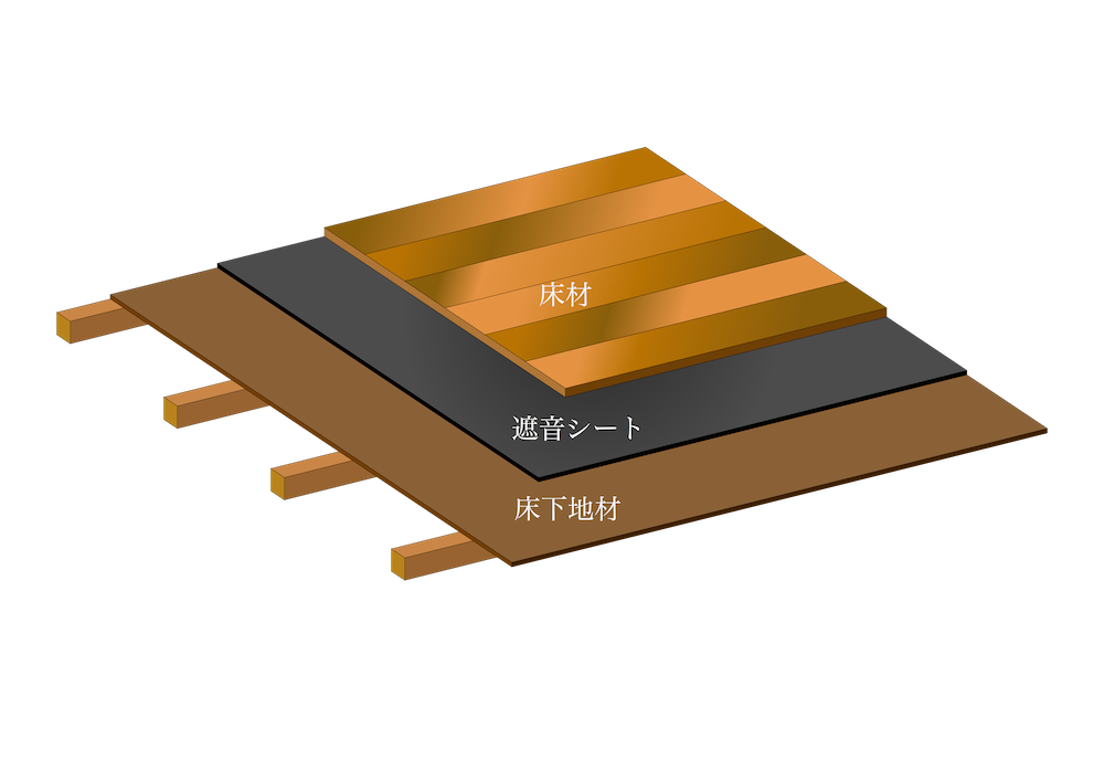 床に対しての防音(下の階への防音)は、遮音シートでしか無いと思います。しかし、遮音シートを内部に現れるように貼らなくても、フローリングの下に設置することで効果は出ます。(新築時、増改築時でないとできませんが)床の遮音はアパートなどの他の家族が住む場合には厳重に厚手のものを(面密度が高いもの)にすべきでしょう。家族であるならば、気にしない音量でも、他人となれば気になる事も増え、生活の時間帯も変わる事が多くなります。
