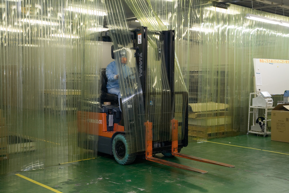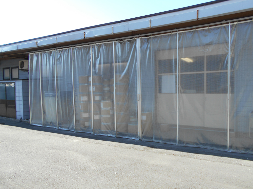 工場・倉庫・店舗の出入り口の雨や風の侵入を防いだり、害虫や外気の侵入の防止。 工場・倉庫内の間仕切りによる冷暖房効率の向上。    工場内外の騒音を遮断、公害防止等の防音用途。目的に応じた間仕切環境を作ることが出来ます。