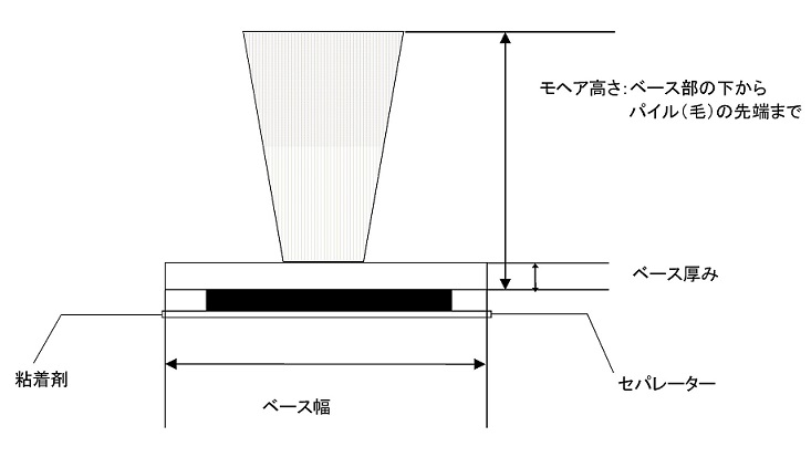 ・すき間モヘアシール モヘア:ポリプロピレン ベース:ポリプロピレン 貼付面:アクリル系両面テープ ・ジャンボすき間モヘアシール モヘア:ナイロン ベース:ポリプロピレン 貼付面:アクリル系両面テープ ポリプロピレンのブラシは毛にコシがあります。 ナイロンのブラシは毛に柔軟性があり、復元力が良好です。