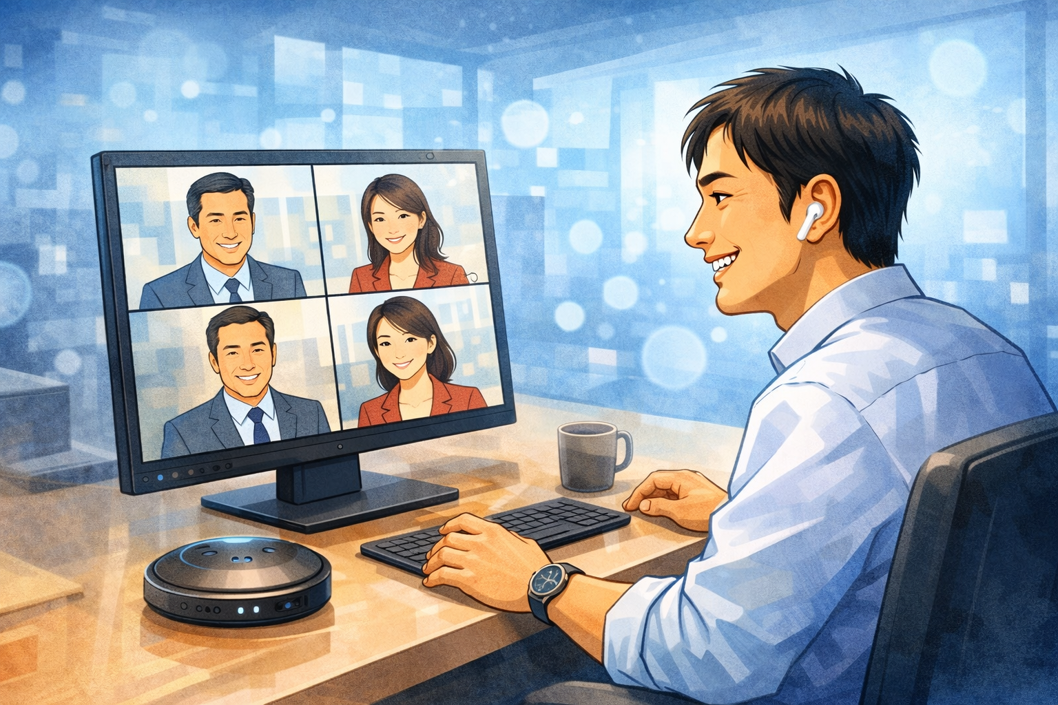 それに比べ、現在のWEB会議用機器は大きく進化しました。マイクを意識して動かすこともほとんどなくなり、自然な姿勢で会話ができます。